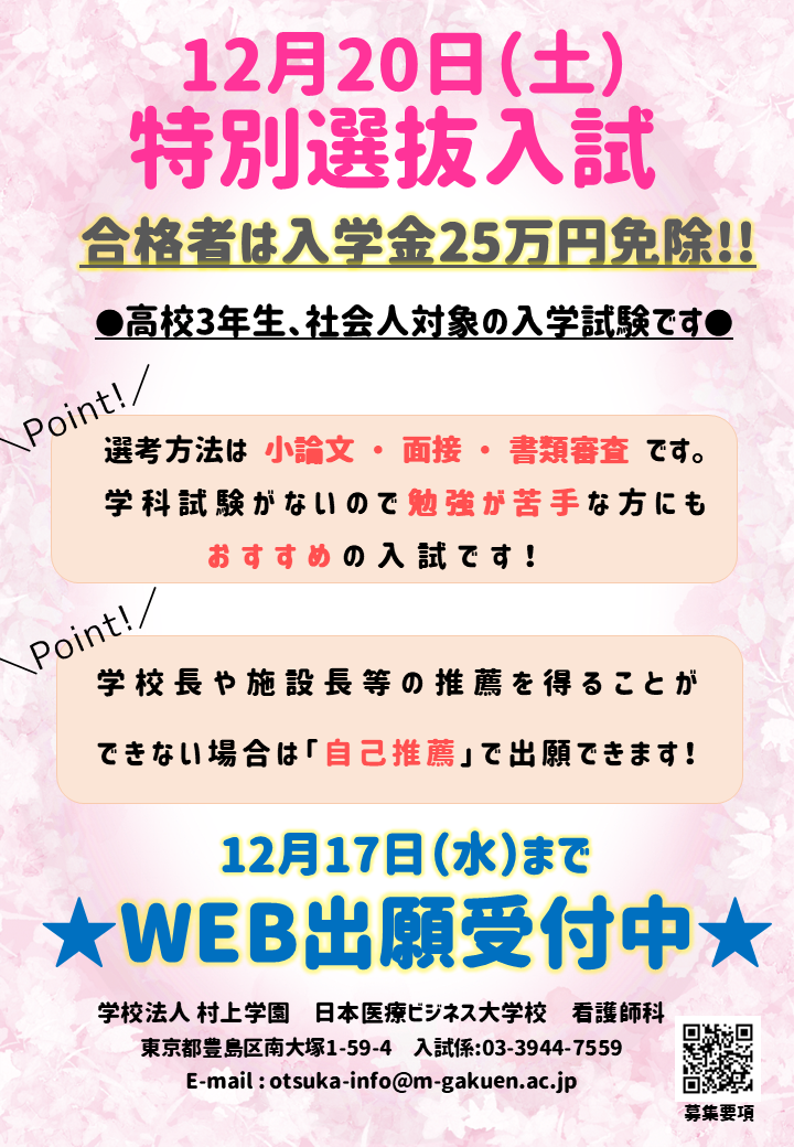 【看護師科】≪入学金25万円免除≫12/20(土)特別選抜入試実施のお知らせ