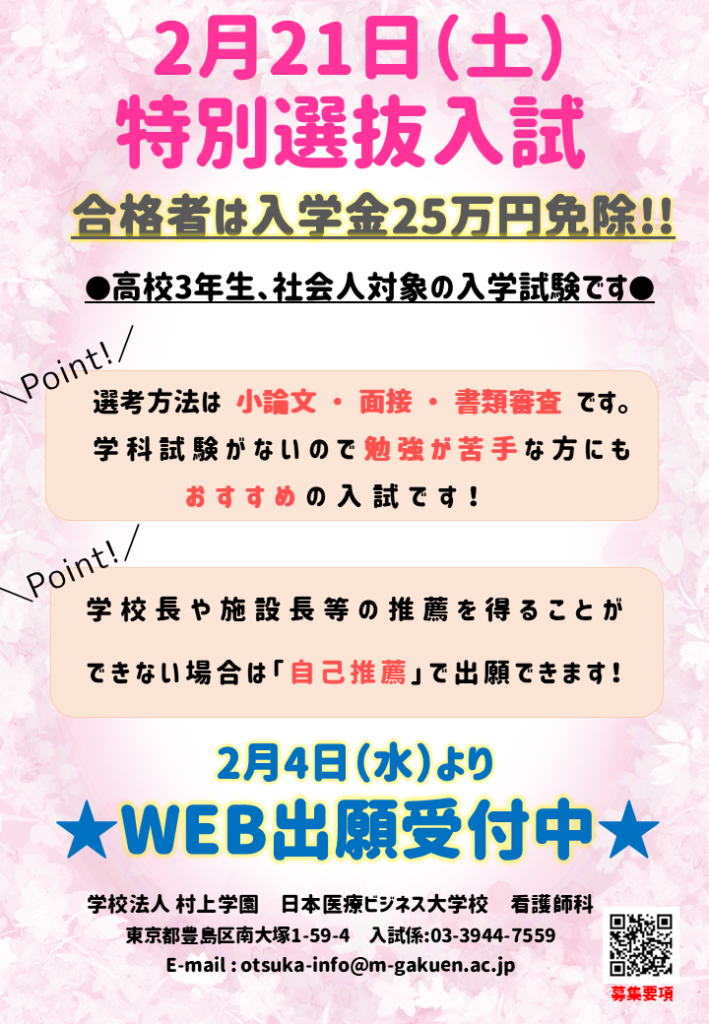 【看護師科】≪入学金25万円免除≫2/21(土)特別選抜入試実施のお知らせ