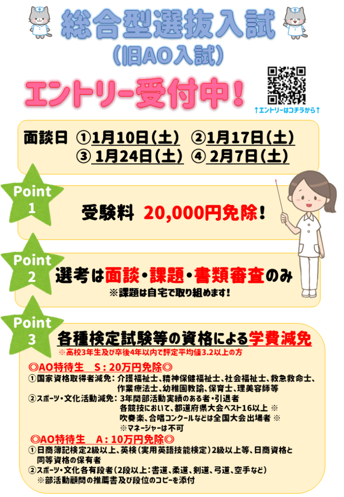 日本医療ビジネス大学校 > 受験生 > 【看護師科】総合型選抜入試(旧AO入試)エントリー受付中!! 2025.12.24 受験生 【看護師科】総合型選抜入試(旧AO入試)エントリー受付中!! 2026年4月入学の総合型選抜入試(AO入試)・エントリーを受付中です! 選考方法は【書類審査】、【面談】と自宅で取り組める【課題】です。 〈受験料20,000円免除〉というメリットもあります! 看護師を目指す皆さんの応募をお待ちしています☆